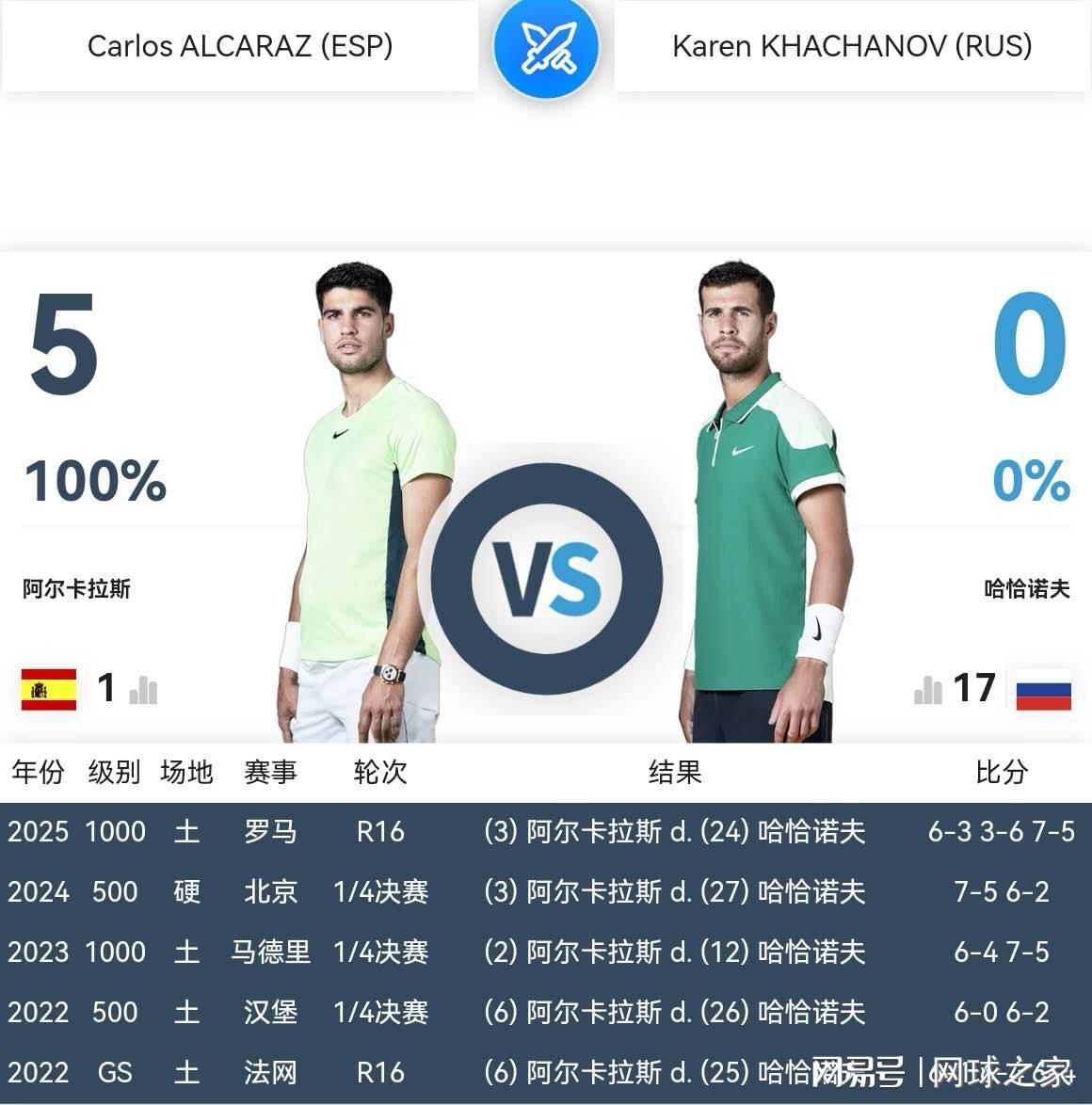 明天凌晨零点三十分,多哈站1/4决赛,阿尔卡拉斯迎来了俄罗斯雷神卡恰诺夫的挑战。这是两人职业生涯第六次交锋,彼此知根知底,不像职业生涯第一次交锋那么陌生,容易产生意外情况。不过,虽然阿尔卡拉斯此前五战全胜,又何敢轻敌疏忽,小心被雷神之锤当头棒喝呢!