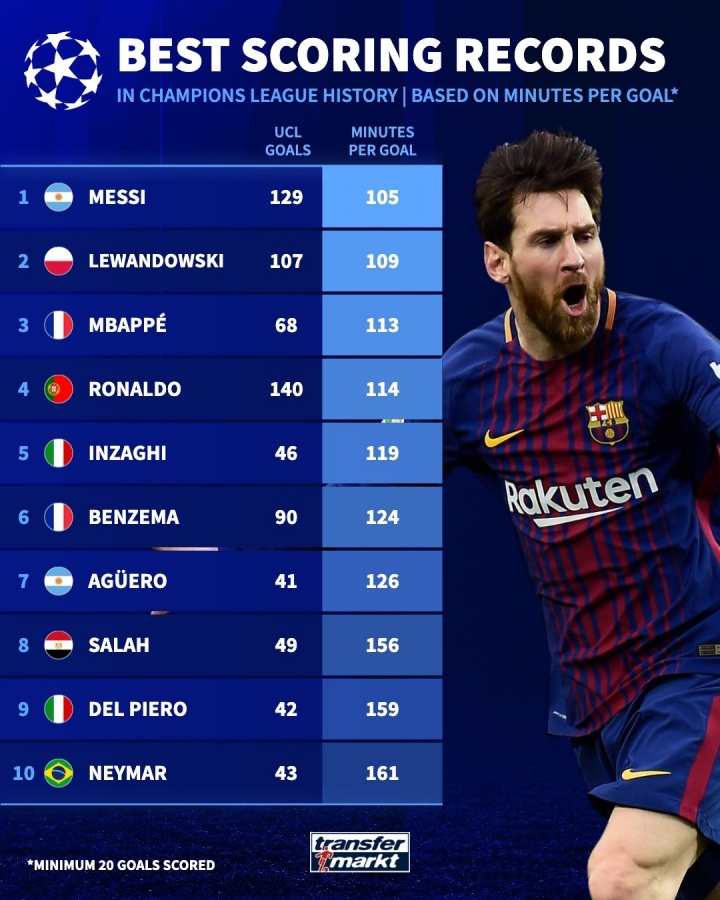 28圈-德转列欧冠每进1球用时排行:梅西105分钟第1,莱万、姆巴佩前三